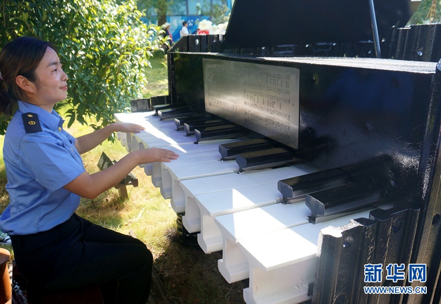 8月17日,向塘長軌基地的工作人員在彈奏一架由廢舊鋼軌制作成的鋼琴。新華網記者劉瓊 攝