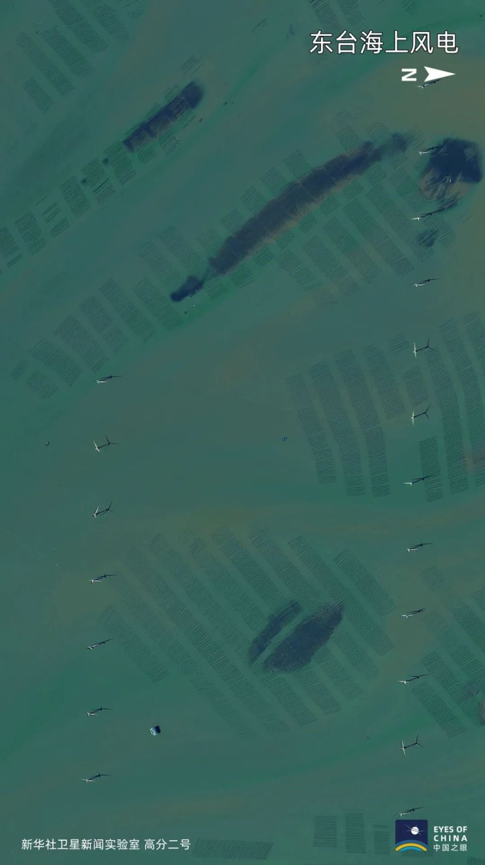 江蘇東臺(tái),漁排間的海上風(fēng)電機(jī)星星點(diǎn)點(diǎn)。2019年中國可再生能源發(fā)電總裝機(jī)容量達(dá)到7.94億千瓦,占全部電力裝機(jī)的39.5%。
