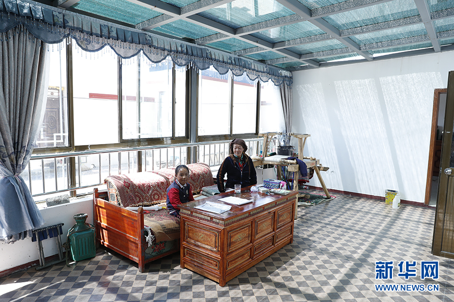 白瑪和她的媽媽坐在客廳里。新華網記者焦鵬 攝