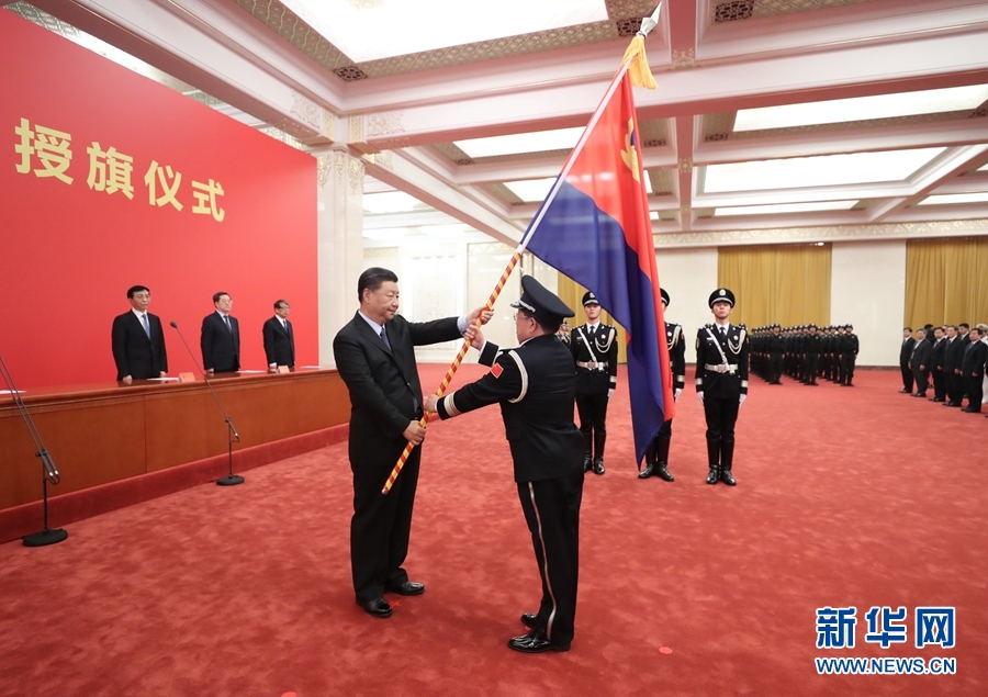 8月26日,中國人民警察警旗授旗儀式在人民大會堂舉行。中共中央總書記、國家主席、中央軍委主席習近平向中國人民警察隊伍授旗并致訓詞。這是習近平向中國人民警察隊伍授旗。 新華社記者 鞠鵬 攝