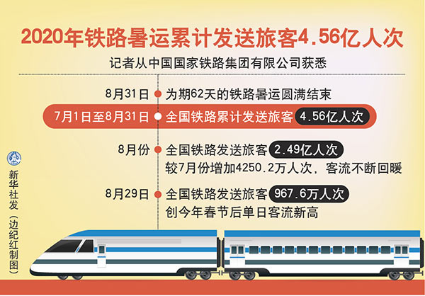 新華社北京9月1日電(記者樊曦)記者從中國國家鐵路集團有限公司獲悉,8月31日,為期62天的鐵路暑運圓滿結束。7月1日至8月31日,全國鐵路累計發送旅客4.56億人次。
