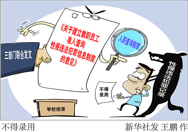 新華社北京9月18日電(記者陳菲)為加強對性侵未成年人犯罪的源頭預防,最高檢、教育部、公安部近期聯合發文,要求在全國建立入職查詢制度,對具有性侵違法犯罪記錄的人員,中小學校、幼兒園不得錄用,教師認定機構不得認定教師資格。
