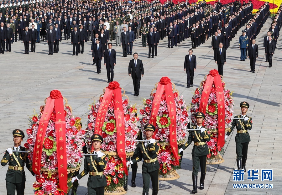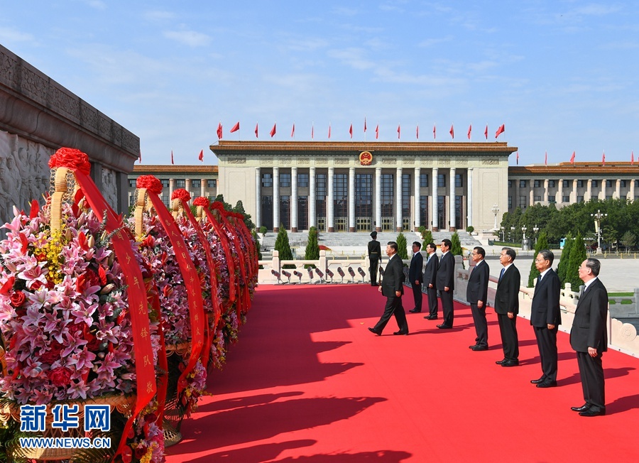 9月30日上午,黨和國家領導人習近平、李克強、栗戰書、汪洋、王滬寧、趙樂際、韓正、王岐山等來到北京天安門廣場,出席烈士紀念日向人民英雄敬獻花籃儀式。 新華社記者 謝環馳 攝