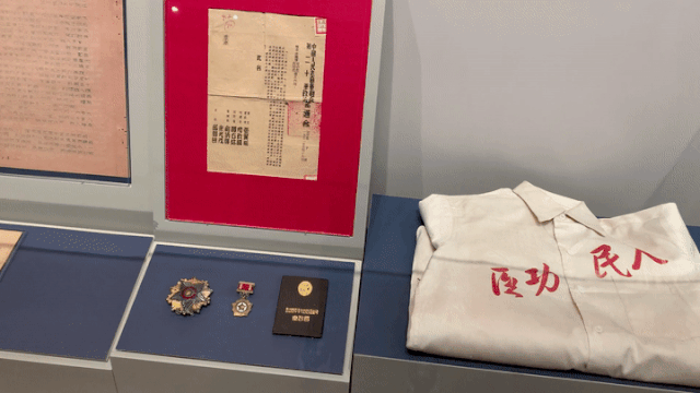 在新華社社史館二樓的展廳里,除了上述文字,還擺放著當年電文的手寫原稿,戰地記者的筆記本、記者證,以及獲得的各種軍功獎章,還有戰場上用過的電文發報機……