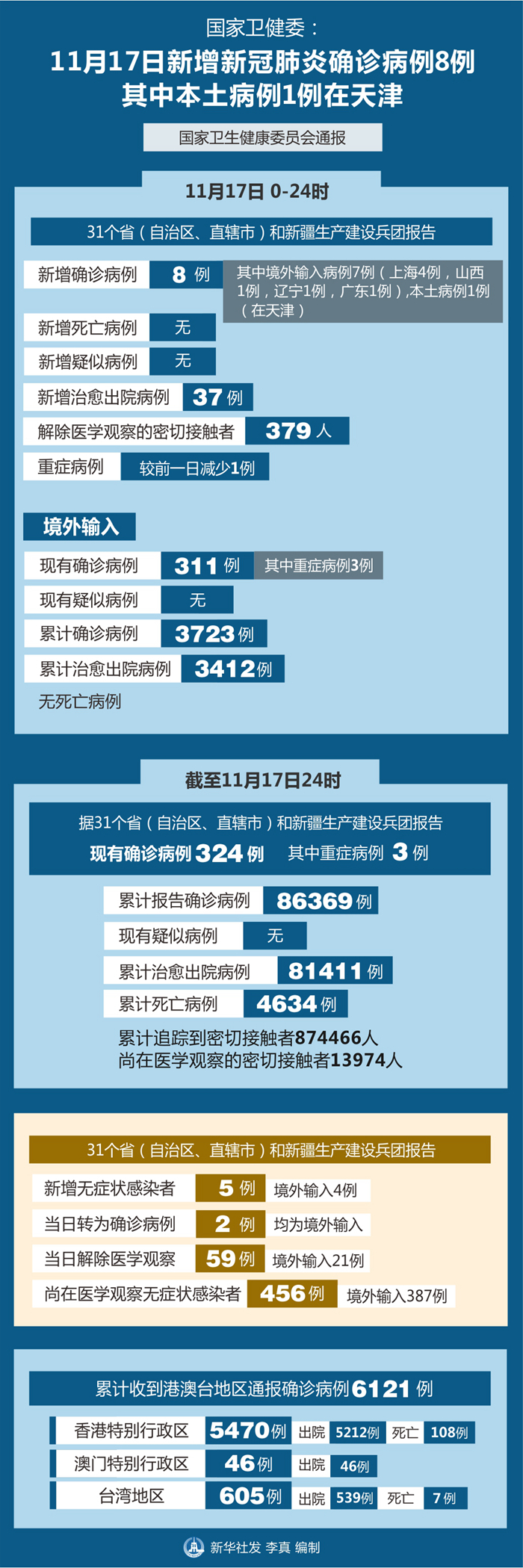 截至11月17日24時,據(jù)31個省(自治區(qū)、直轄市)和新疆生產(chǎn)建設(shè)兵團(tuán)報告,現(xiàn)有確診病例324例(其中重癥病例3例),累計治愈出院病例81411例,累計死亡病例4634例,累計報告確診病例86369例,無現(xiàn)有疑似病例。累計追蹤到密切接觸者874466人,尚在醫(yī)學(xué)觀察的密切接觸者13974人。