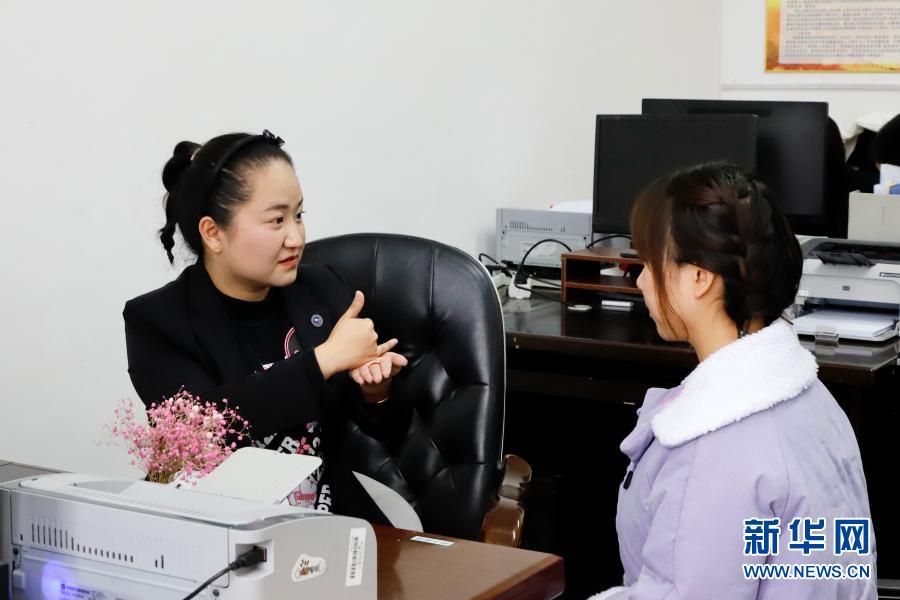 11月18日,在黑龍江綏化學院,李澤卉(左)用手語和學生交流。新華社發(黃龍斌 攝)