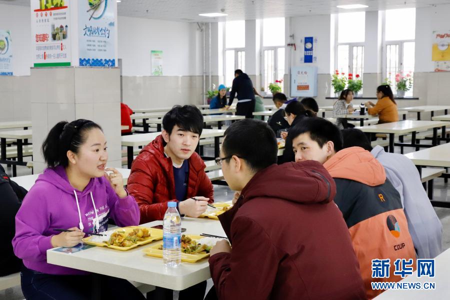 11月18日,在黑龍江綏化學院,李澤卉(左一)與學生一起吃飯。新華社發(黃龍斌 攝)