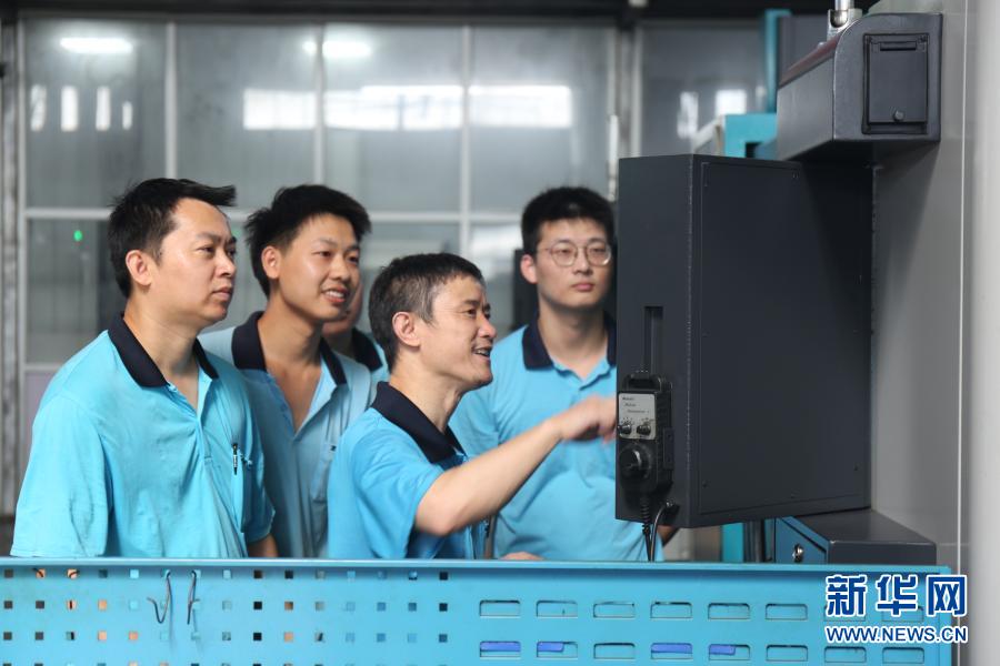 全國勞動模范、寧波中大力德智能傳動股份有限公司設(shè)備科科長萬亞勇(右二)在車間指導員工進行數(shù)控機床故障診斷(8月17日攝)。新華社發(fā)