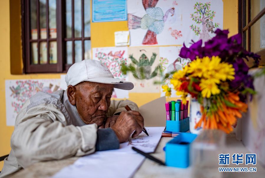 85歲的彝族老農羅家政平日喜歡坐在家門口畫畫,用水彩筆畫村莊、花草、大山、飛鳥、人物……住上了寬敞明亮的搬遷安置房,院子里滿眼是瓜果蔬菜,老人有了閑情逸致。