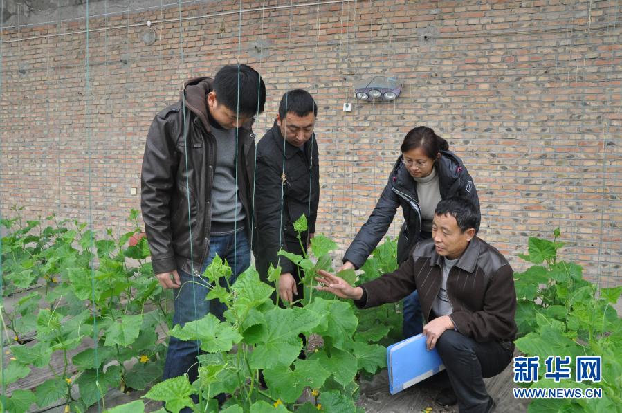 李加旺(右一)與課題組成員一起觀察黃瓜植株的生長(zhǎng)情況(2014年11月27日攝)。新華社發(fā)(天津科潤(rùn)黃瓜研究所供圖)