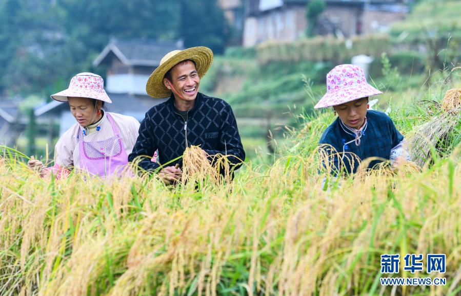 貴州省從江縣加榜鄉加車村的農民在收割水稻(9月19日攝)。
