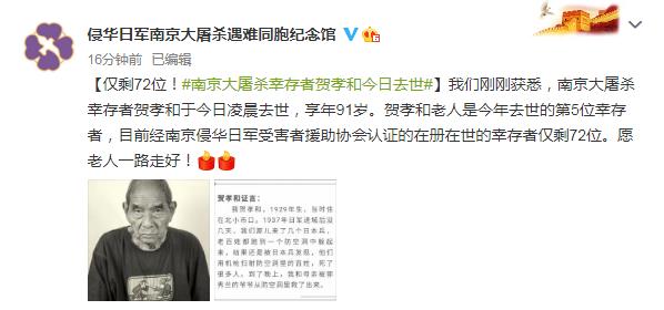 據(jù)侵華日軍南京大屠殺遇難同胞紀念館官方微博消息,南京大屠殺幸存者賀孝和于今日凌晨去世,享年91歲。賀孝和老人是今年去世的第5位幸存者,目前經(jīng)南京侵華日軍受害者援助協(xié)會認證的在冊在世的幸存者僅剩72位。