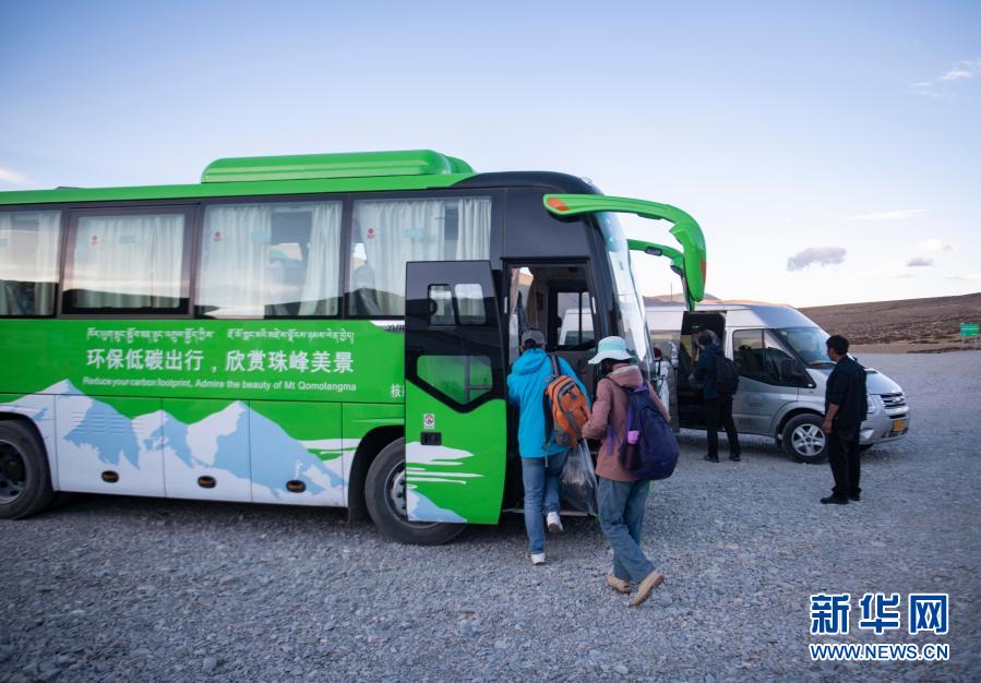 游客在珠穆朗瑪峰景區停車場轉乘環保客車(2019年5月16日攝)。珠穆朗瑪峰景區內自2019年5月開始試運營清潔能源環保客車,以進一步平衡珠峰地區旅游發展與環境保護需要。新華社記者 孫非 攝