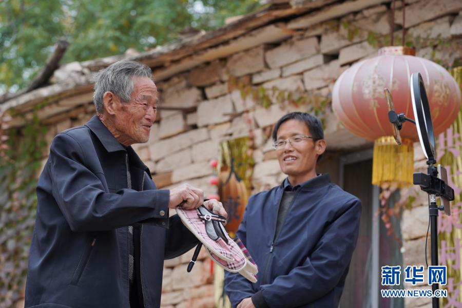 2020年10月28日,河北省沙河市柴關鄉大康村老支書李三平(左)在直播中推介村民手工制作的布鞋。今年年初,李三平在兒子李慶斌直播推介農產品的過程中,應網友的要求加入直播,收獲了眾多網友點贊。在他的努力下,大康村的小米、蜂蜜等貨品銷路越來越廣,慕名前來的游客也更多了。