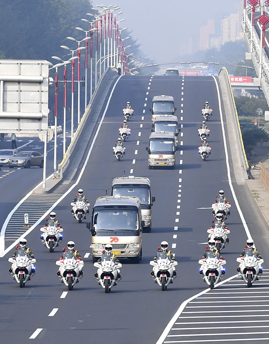 29日上午,國家勛章和國家榮譽(yù)稱號獲得者集體乘坐禮賓車從住地出發(fā),在英姿颯爽的國賓護(hù)衛(wèi)隊(duì)護(hù)衛(wèi)下,匯成一列車隊(duì),向人民大會(huì)堂進(jìn)發(fā)。