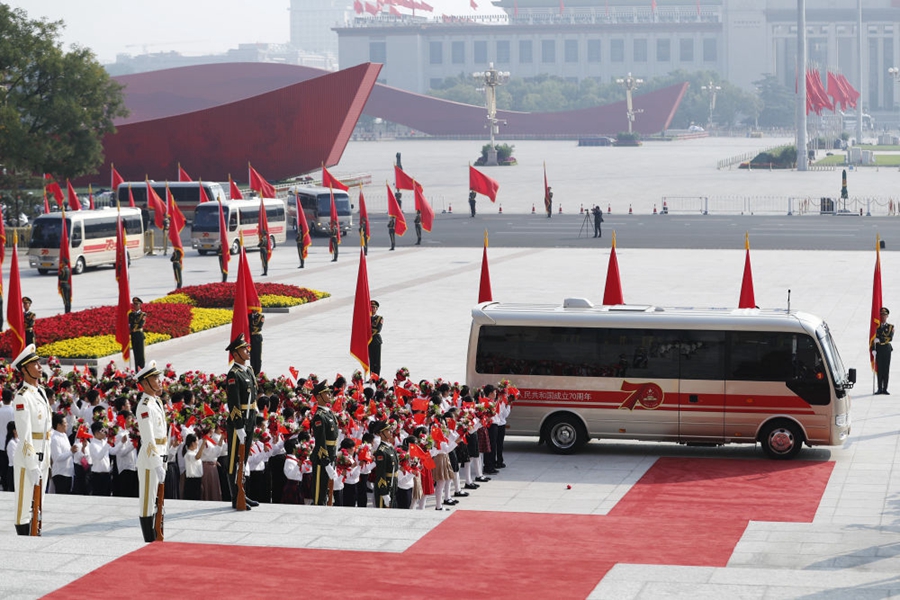 人民大會(huì)堂東門外,高擎紅旗的禮兵分列道路兩側(cè),肩槍禮兵在臺(tái)階上莊嚴(yán)佇立。車隊(duì)抵達(dá)時(shí),早已迎候在這里的青少年們迸發(fā)出熱情的歡呼。