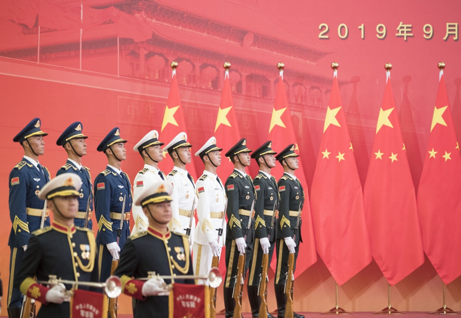 儀式號角奏響,2名護(hù)旗手高擎五星紅旗,3名禮兵手捧共和國勛章、友誼勛章和國家榮譽(yù)稱號獎(jiǎng)?wù)拢~著雄健的步伐,正步行進(jìn)到授勛現(xiàn)場。