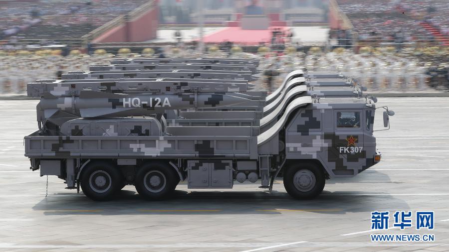 新華社北京10月1日電(記者張玉清、張汨汨)8輛紅旗-12A地空導彈發射車和4個紅旗-6A彈炮系統火力單元組成的地空導彈第2方隊,10月1日通過天安門接受檢閱。方隊領隊是朱瑞少將、董玉江少將。