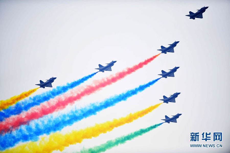 新華社北京10月1日電(張汨汨、周正新)1架空警-2000預警機和8架殲-10飛機組成領隊機梯隊,10月1日飛臨天安門廣場上空接受檢閱。殲-10飛機拉出七道絢麗的彩煙,慶祝新中國成立70周年。