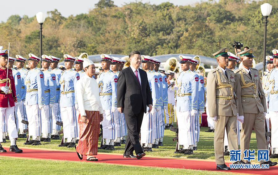 當(dāng)?shù)貢r(shí)間1月17日下午,國(guó)家主席習(xí)近平在內(nèi)比都總統(tǒng)府出席緬甸總統(tǒng)溫敏舉行的隆重歡迎儀式。這是習(xí)近平在溫敏陪同下檢閱儀仗隊(duì)。 新華社記者 黃敬文 攝