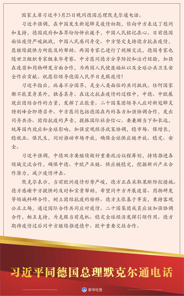 習(xí)近平強(qiáng)調(diào),在中國發(fā)生新冠肺炎疫情初期,你向中方表達(dá)了慰問和支持,德國政府和各界紛紛伸出援手,中國人民銘記在心。目前德國面臨疫情嚴(yán)峻挑戰(zhàn),中國人民感同身受。中方堅(jiān)定支持德方抗擊疫情,愿繼續(xù)提供力所能及的幫助。兩國專家已進(jìn)行了視頻交流,德國專家也隨世衛(wèi)組織專家組來華考察。中方愿同德方分享防控和治療經(jīng)驗(yàn),加強(qiáng)在疫苗和藥物研發(fā)方面合作,為兩國人民健康福祉以及全球公共衛(wèi)生安全作出貢獻(xiàn)。祝愿你領(lǐng)導(dǎo)德國人民早日克服疫情!