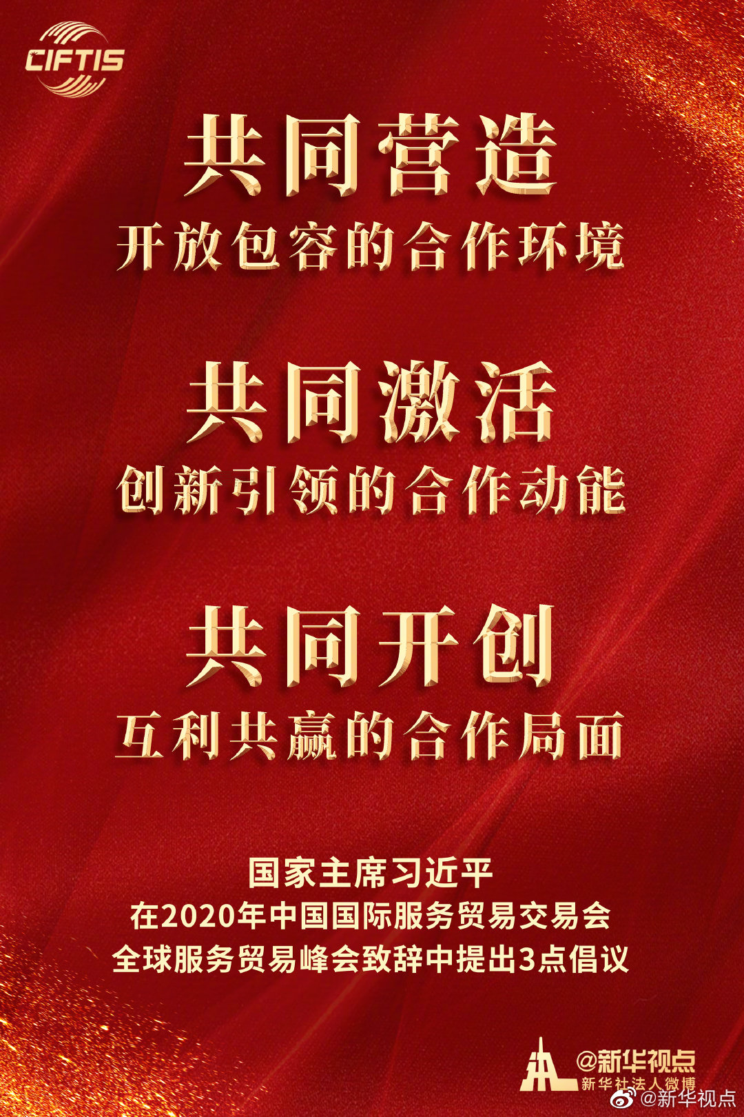 國家主席習近平在2020年中國國際服務貿易交易會全球服務貿易峰會上發表視頻致辭時就服務業開放合作提出3點倡議:共同營造開放包容的合作環境;共同激活創新引領的合作動能;共同開創互利共贏的合作局面。?