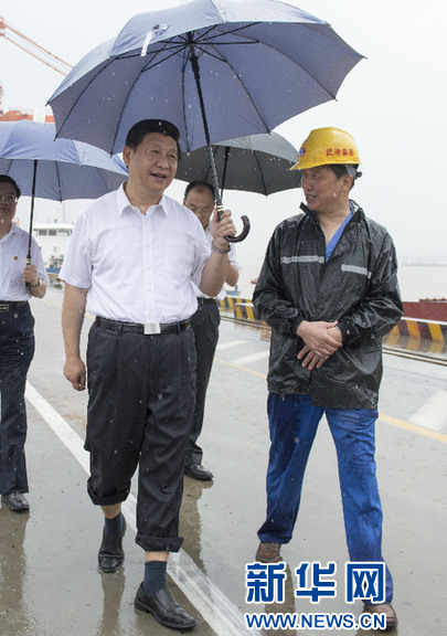 2013年7月,習近平來到武漢考察,一下飛機就冒雨來到武漢新港陽邏集裝箱港區(qū)。