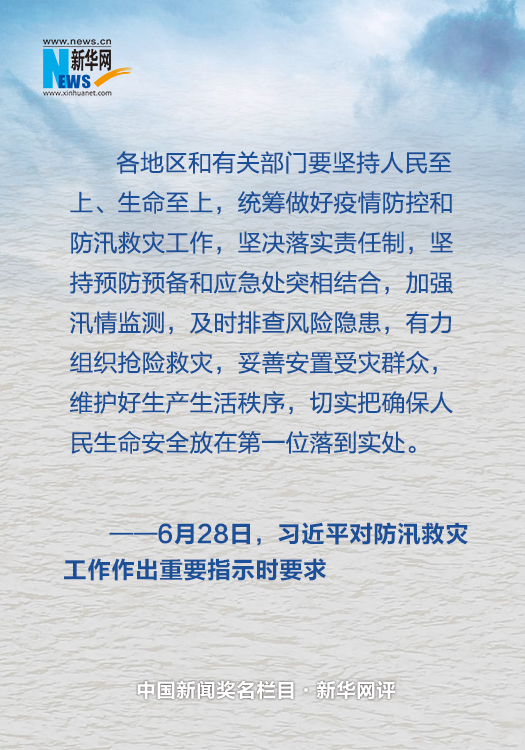 要堅持人民至上、生命至上。人民高于一切,生命重于泰山。無論防控疫情,還是抗洪搶險,都要切實把確保人民生命安全放在第一位落到實處。在做好疫情防控的同時,一定要有力組織搶險救災,強化應急搶險人員轉(zhuǎn)移安置,落實基層轉(zhuǎn)移避險的責任,細化避險轉(zhuǎn)移預案,在需要的時候果斷轉(zhuǎn)移有危險的群眾,妥善安置受災群眾,千方百計減少人員傷亡。