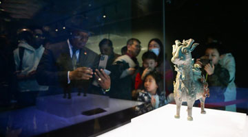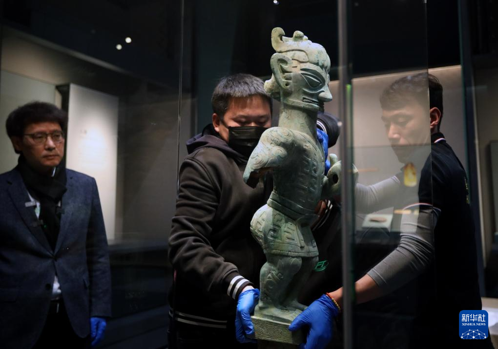 1月29日,工作人员将竖披发青铜人像移入展柜。