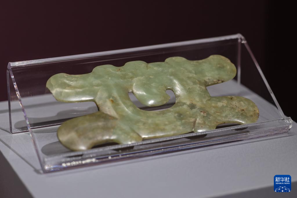 6月8日在“文明之光——红山·良渚与中华文明”主题展览上拍摄的红山文化勾云形玉器。