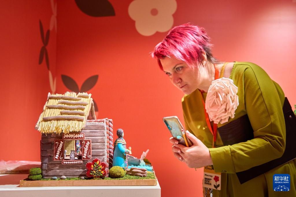 10月11日,在符拉迪沃斯托克姜饼节活动现场,一名评委正在欣赏姜饼作品。