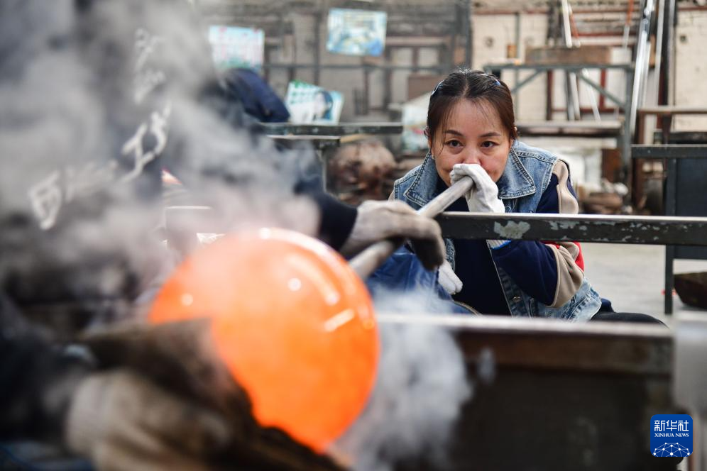 1月9日,在淄博市博山区的西冶工坊,工匠在加工琉璃工艺品。