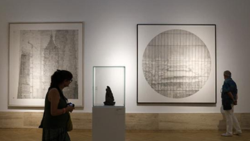 7月24日,国防大学军事文化学院副教授王树山在查看自己的雕塑作品。