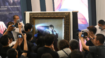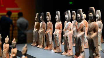 7月17日,解放军文工团雕塑创作员郎钺在擦拭雕塑。