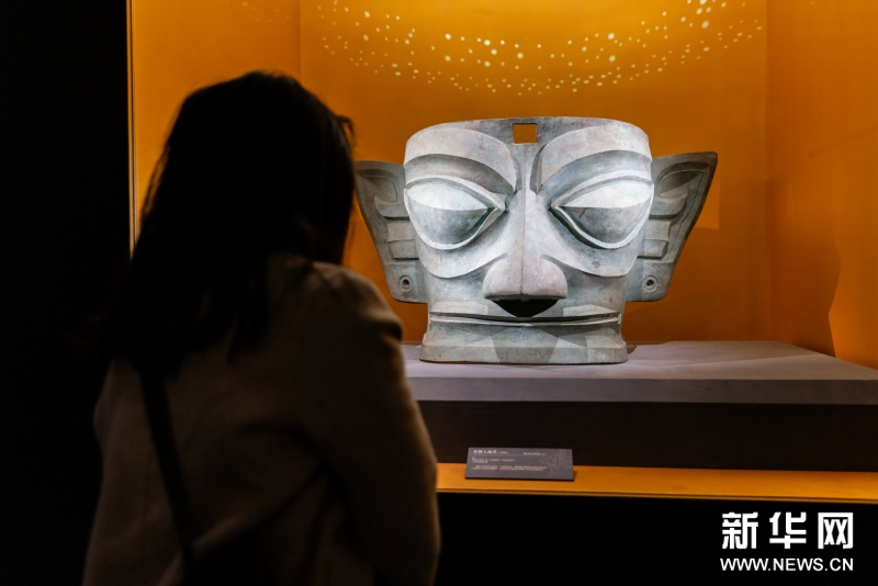 展品包括金辉璀璨的太阳神鸟金饰,双目如棱的戴金面罩青铜人头像,玄奇诡谲的戴冠纵目面具,以及青铜立人像、龙柱形青铜器、肩扛象牙人形纹玉璋等,这些先民的杰作,共同勾勒出一个瑰丽精彩的古蜀社会,也彰显了中华文明和而不同的宏大气象。