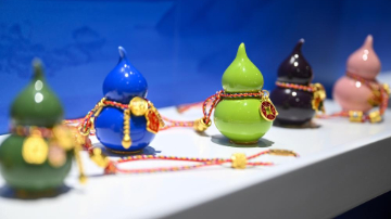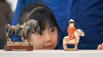 2月10日,参观者在一个三彩马展品前驻足观看。