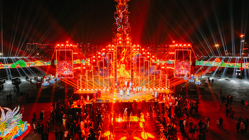 鳌鱼、麒麟彩车组成的巡游队伍缓缓前行,演员扮作神仙精灵沿途抛洒祝福;千架无人机腾空而起,在夜空勾勒出飞马腾空、金龙摆尾的浪漫图案,“爱你老己”的字样更是让不少游客湿了眼眶;科技篝火旁,游客自发围成圈牵手欢唱,陌生人之间的距离在欢声笑语中悄然拉近。百姓才艺大比拼的舞台上,民间高手各展所长;相亲大会里,浪漫缘分悄然萌芽。有人收获掌声,有人邂逅美好。