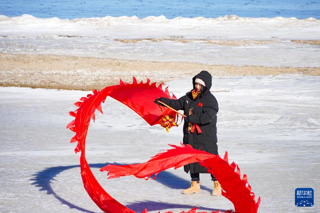 12月27日,一名徒步爱好者在活动中舞动彩带龙。