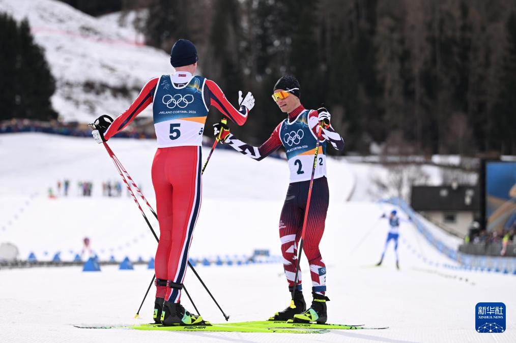 2月17日,挪威选手奥夫特布罗(左)和奥地利选手兰帕特尔在比赛后。