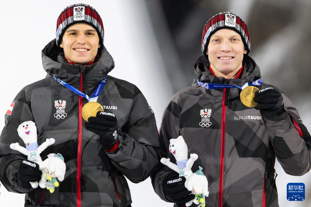 2月16日,冠军奥地利队(中)、亚军波兰队(左)、季军挪威队在颁奖仪式上。