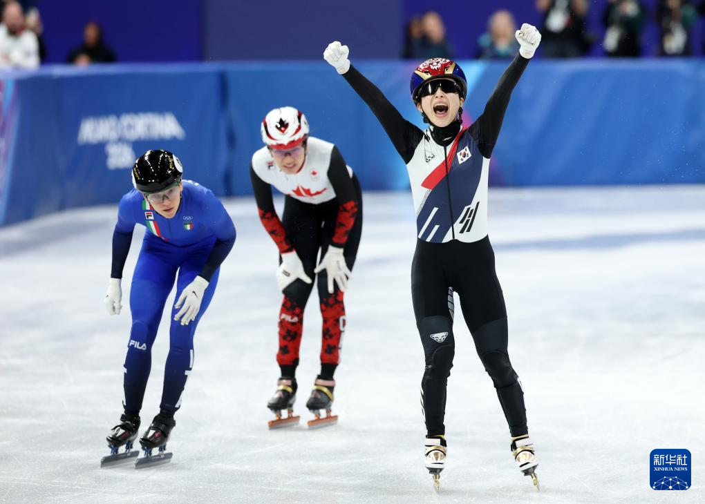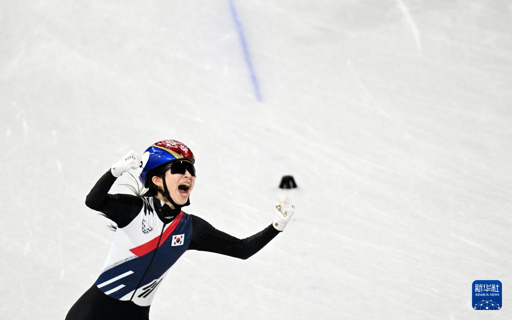 2月18日,韩国队选手金吉莉率先冲线后庆祝。