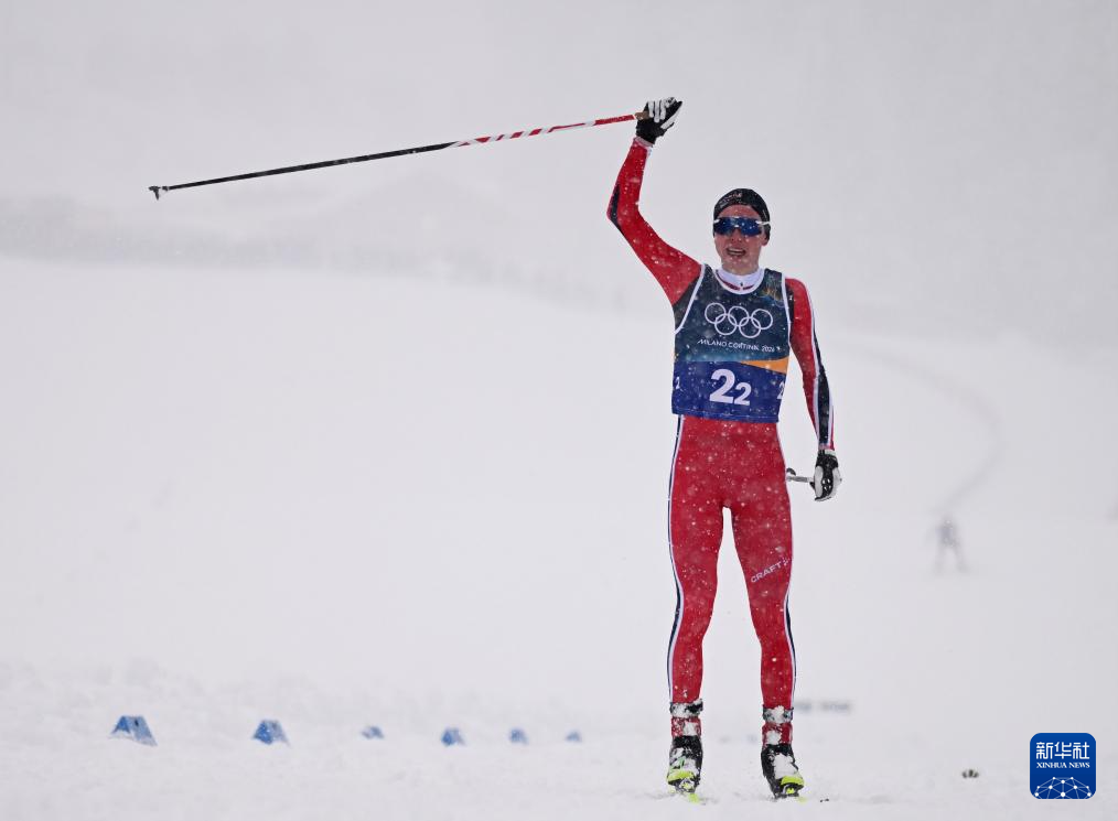 2月19日,挪威队选手奥夫特布罗在冲线后庆祝。