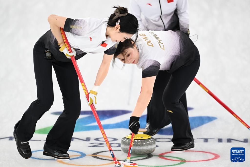 2月19日,中国队选手姜嘉怡(下)在比赛中掷壶。