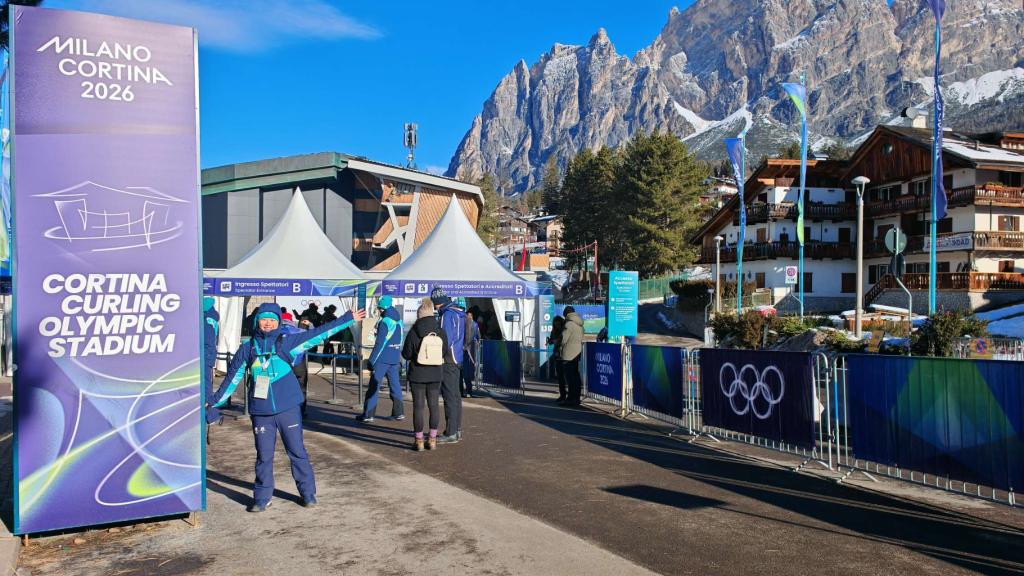 ↑在科尔蒂纳冰壶馆前的引导志愿者钟昕