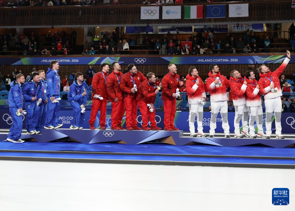 2月21日,冠军加拿大队(中)、亚军英国队(左)和季军瑞士队在颁奖仪式上合影。