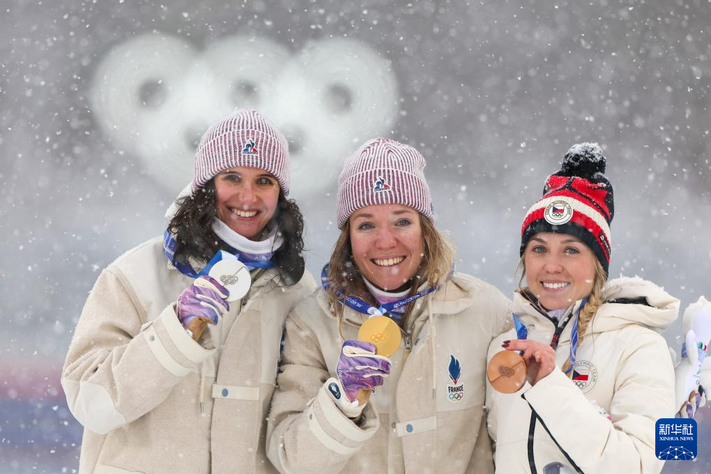 2月21日,冠军法国选手米舍隆(中)、亚军法国选手西蒙(中)和季军捷克选手沃博尔尼科娃在颁奖仪式上合影。