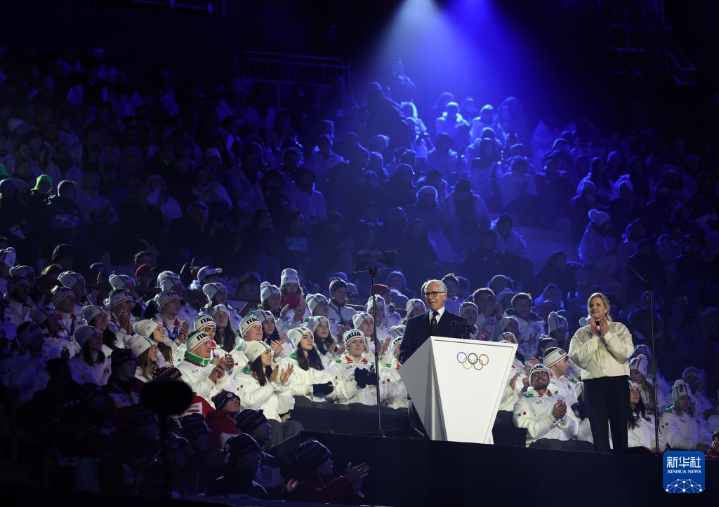 2月22日,米兰-科尔蒂纳冬奥会组委会主席乔瓦尼·马拉戈(前左)在闭幕式上发言。