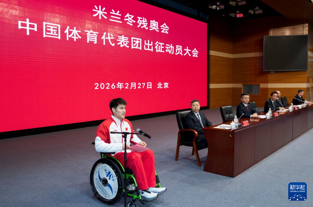 2月27日,运动员、教练员等出席米兰冬残奥会中国体育代表团出征动员大会。