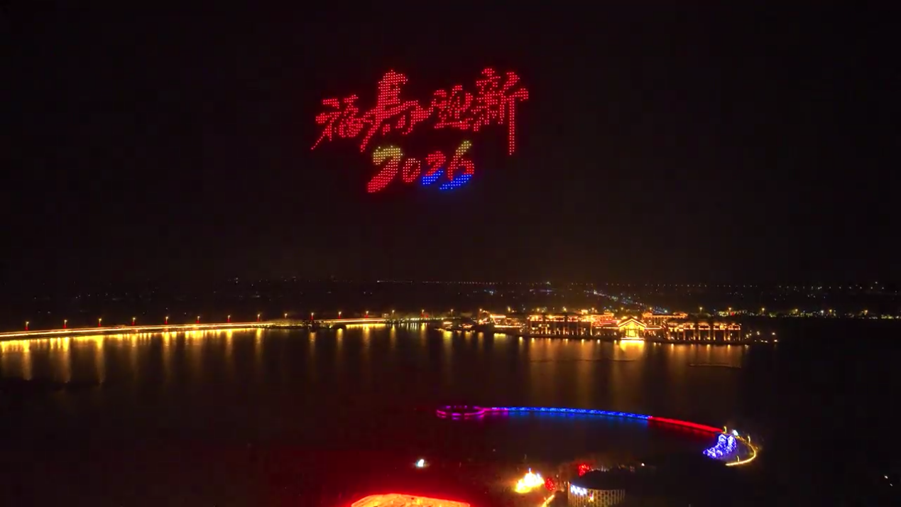 表演尾声,璀璨烟花在夜空绽放,千架无人机顺势蝶变成五彩斑斓的“我爱阜宁金沙湖”图案,将新春的浪漫与美好定格在金沙湖畔,也定格在每一位观众的心中。