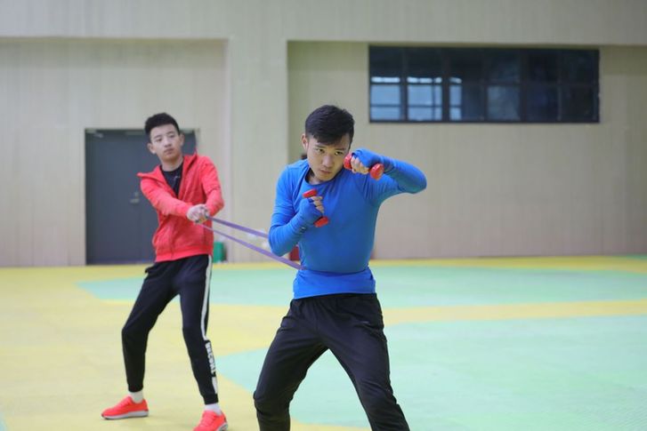 “通過啞鈴鍛煉肩部耐力,腳腕綁沙袋練習(xí)移動(dòng)速度,用杠鈴加強(qiáng)出拳力量和爆發(fā)力,配合手靶全面練習(xí)。因?yàn)槭菑牧汩_始,要想拿到成績(jī),必須付出成倍的努力。”趙佳偉說。